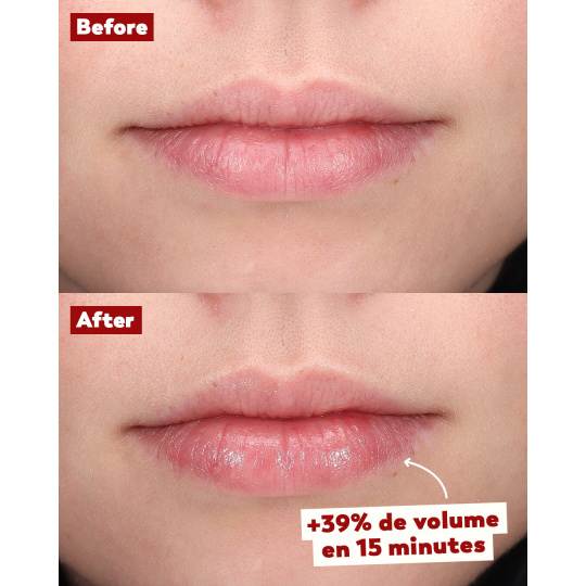 - Přirozeně zvětšuje objem rtů a dodává jim plnější a zdravější vzhled (+39 % objemu za 15 minut).