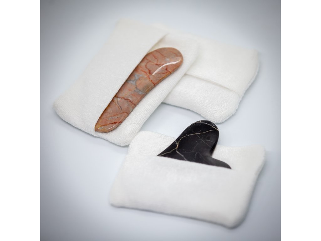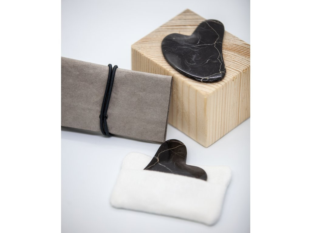 Guasha destička na obličej, určená k domácímu použití a vyrobená v České republice z luxusního italského mramoru Nero portoto. Tvar destičky je přizpůsoben tak, aby dokonale přilnul ke všem obličejovým partiím a ty tak mohly být správně ošetřeny.