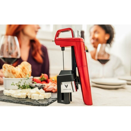 Zařízení Coravin přiložíte k hrdlu láhve, které sevřete chytrým mechanismem pro vystředění jehly na osu korku. Poté plynulým pohybem zatlačíte na horní stranu zařízení a Coravin jehla pronikne korkem bez jeho výraznějšího poškození.