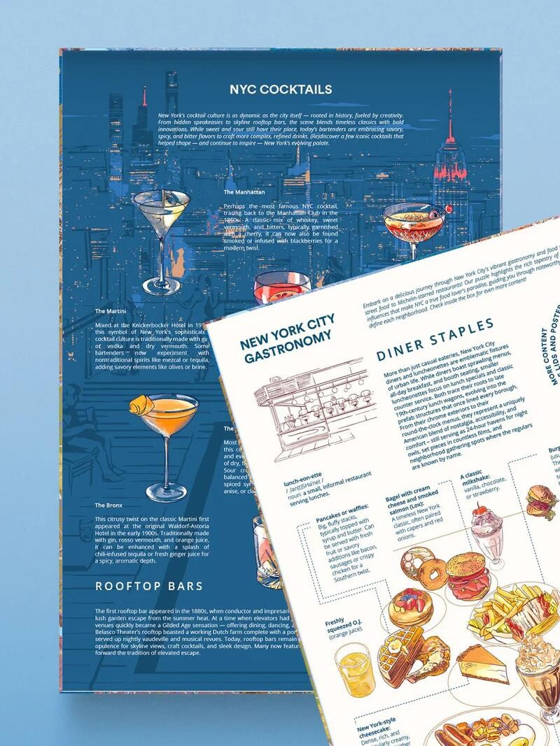 Ochutnejte Big Apple s naší New York Gourmet Puzzle, živou ilustrovanou mapou oslavující bohaté a rozmanité kulinářské dědictví města. Projděte se městskými čtvrtěmi a objevte místní gastronomické speciality, od historických židovských delikates v Lower East Side po harlemské soul food restaurace a ikonické dinery, „skutečnou Malou Itálii“ v Bronxu a nejlepší místa v Brooklynu. Toto puzzle vám naservíruje plný talíř nejchutnějších tradic NYC!