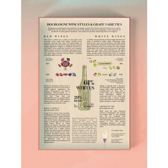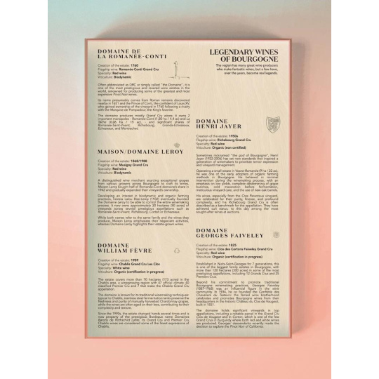 Na krabici puzzle a plakátu najdete pokladnici informací, včetně podrobné mapy Côte d'Or, průvodce burgundskými vinařskými etiketami, informace o stylech vín a odrůdách hroznů a profily některých z nejlepších burgundských vinařství. Tato zkušenost je navržena tak, aby prohloubila vaše ocenění burgundského vinařského dědictví a zlepšila vaše porozumění jeho složité vinařské kultuře a systému apelací.