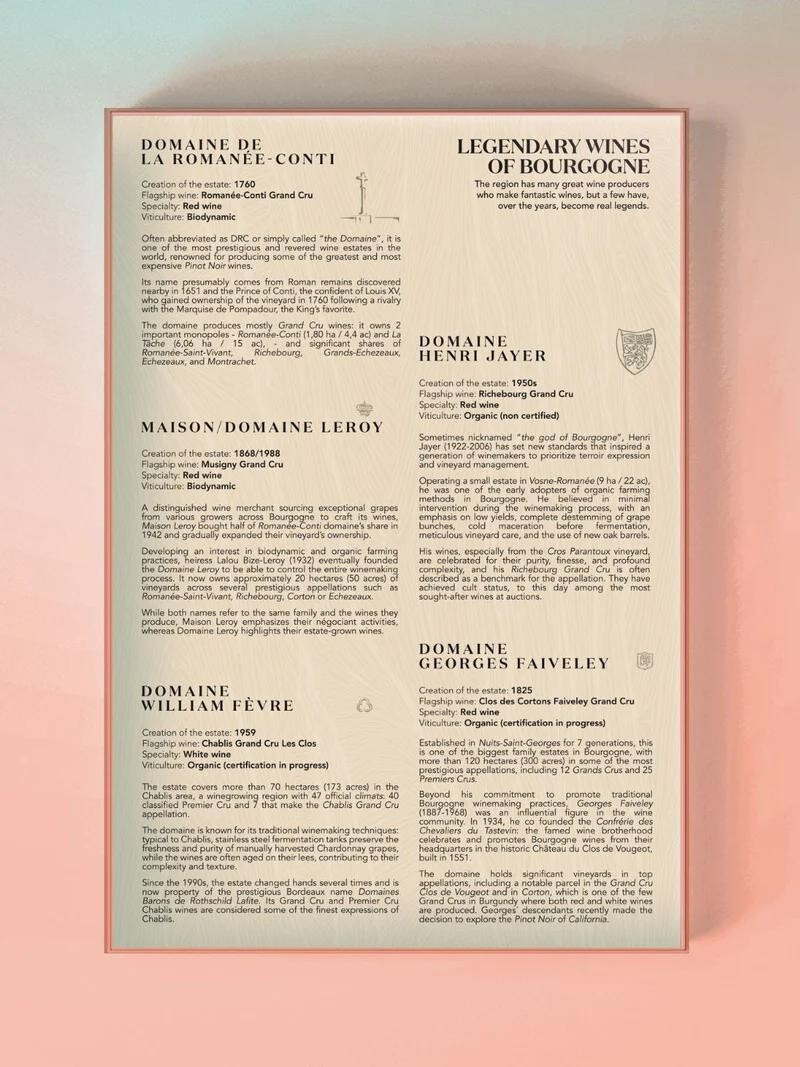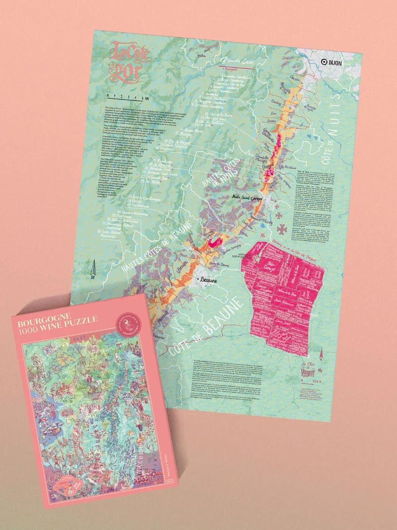 Na krabici puzzle a plakátu najdete pokladnici informací, včetně podrobné mapy Côte d'Or, průvodce burgundskými vinařskými etiketami, informace o stylech vín a odrůdách hroznů a profily některých z nejlepších burgundských vinařství. Tato zkušenost je navržena tak, aby prohloubila vaše ocenění burgundského vinařského dědictví a zlepšila vaše porozumění jeho složité vinařské kultuře a systému apelací.
