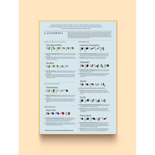 Puzzle s tématikou kalifornských vinařských oblastí a klíčových odrůd typických právě pro Kalifornii. Krabička obsahuje také profily jednotlivých odrůd, jejich charakteristické vůně a chutě se spoustou tipů na snoubení s jídlem! Ilustrace byly nejprve ručně nakresleny a stojí za nimi Derek Fenech, poté pečlivě zkontrolovány s pomocí nejlepších světových someliérů.