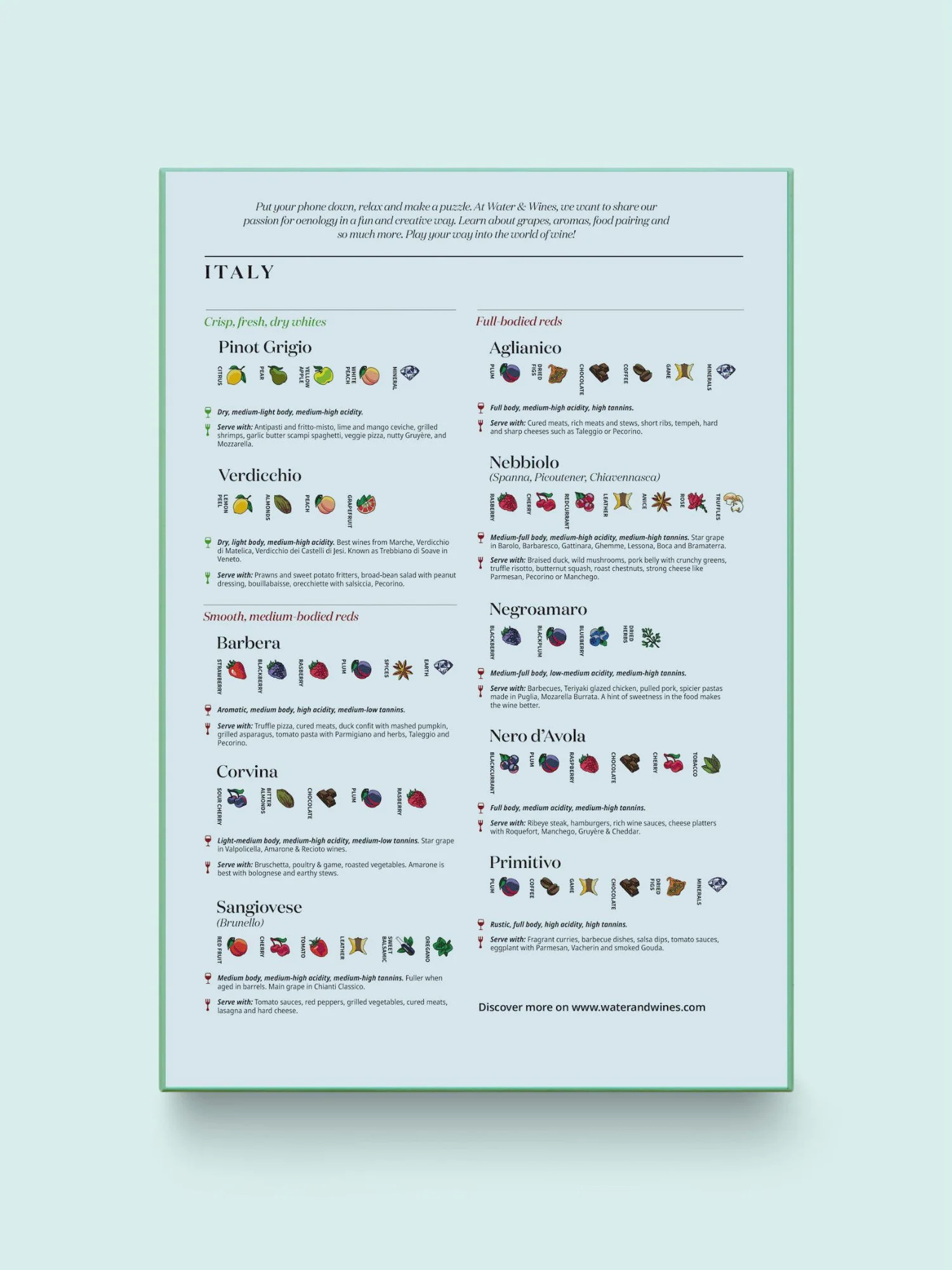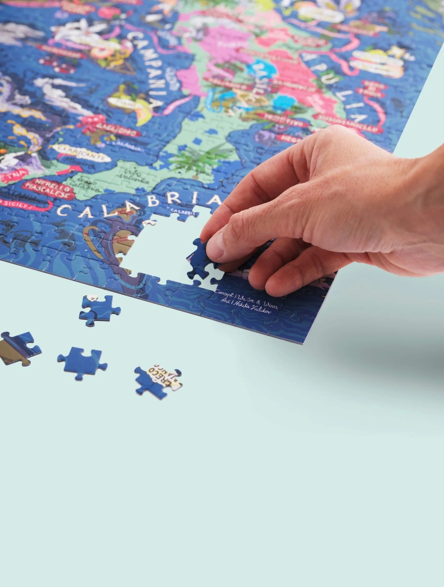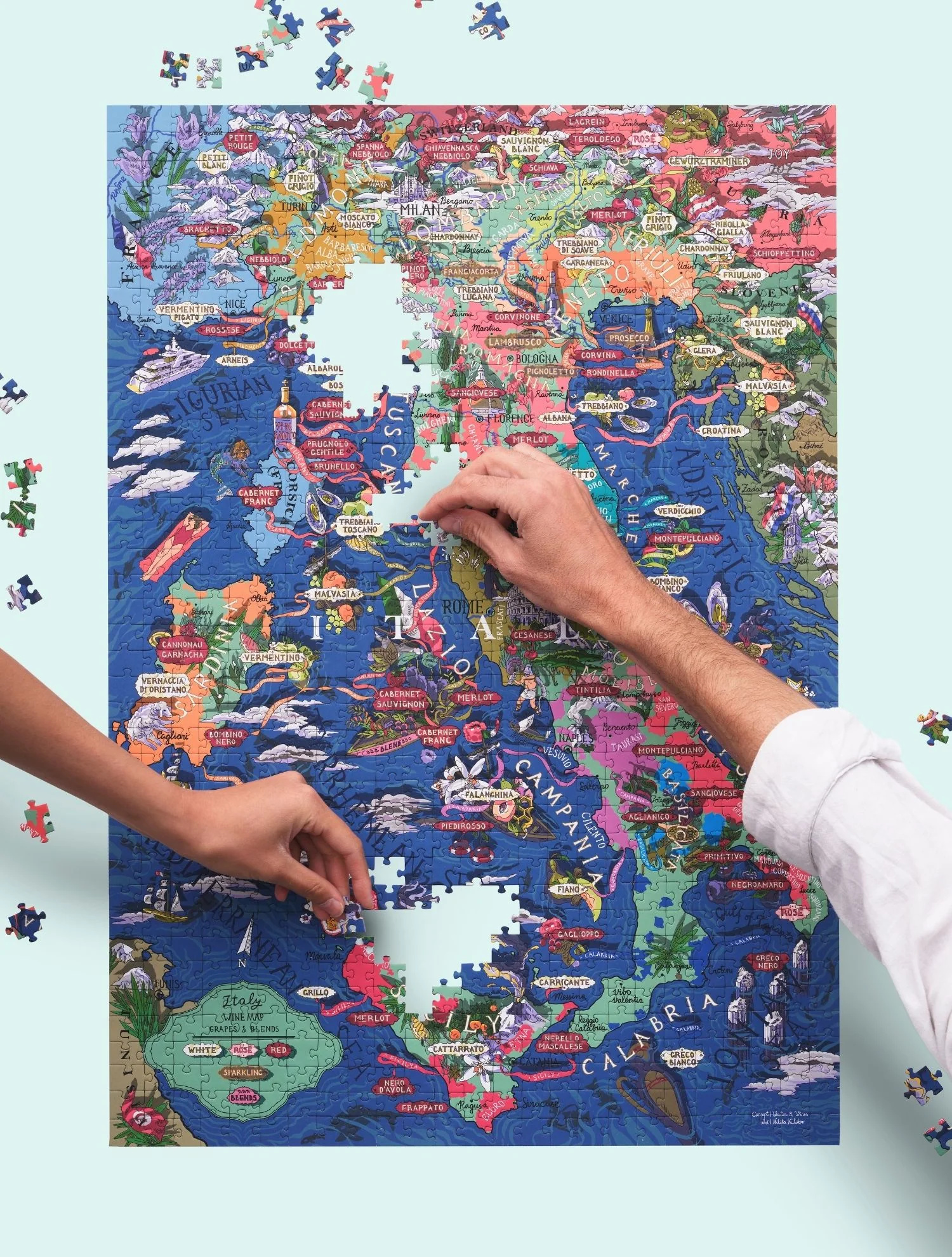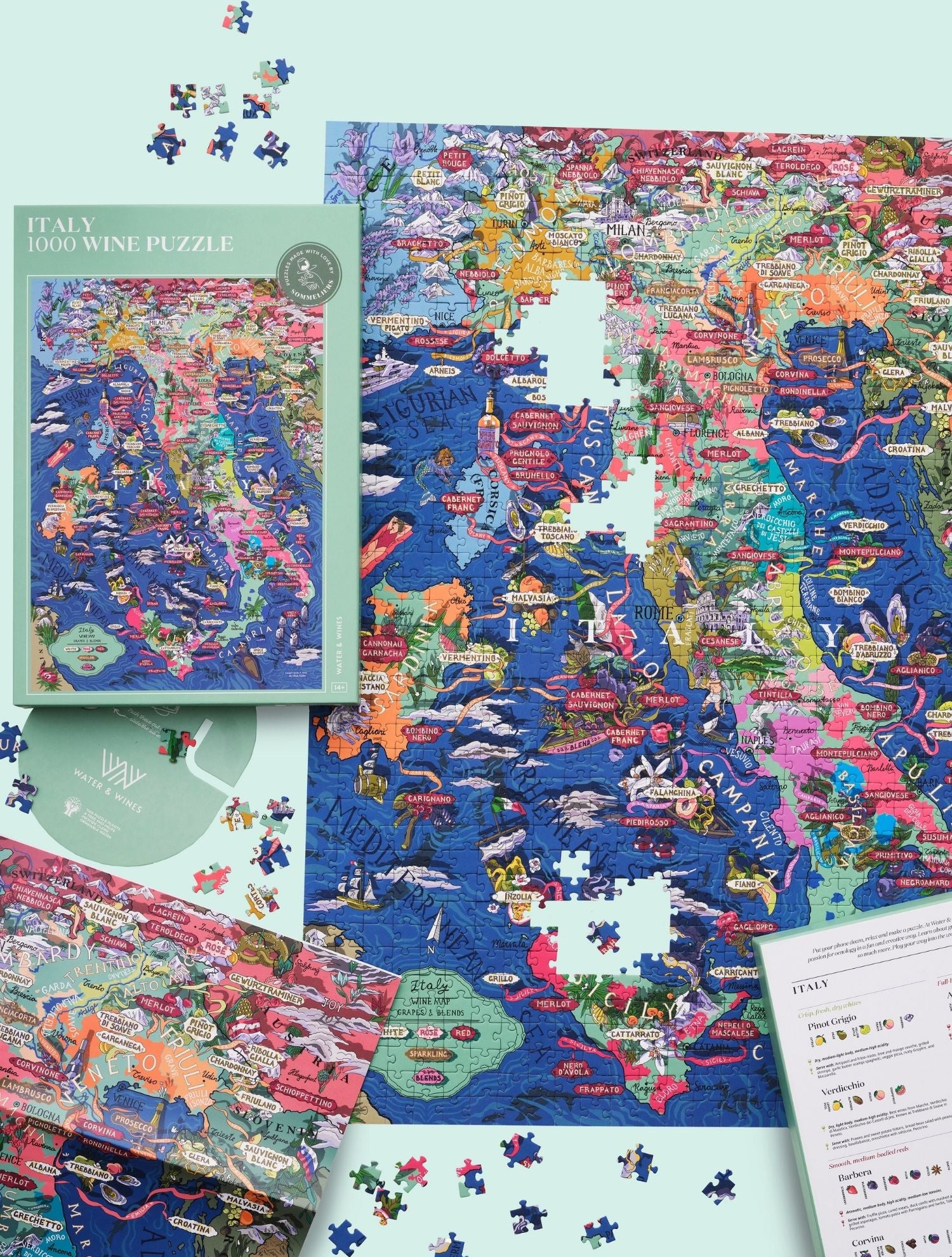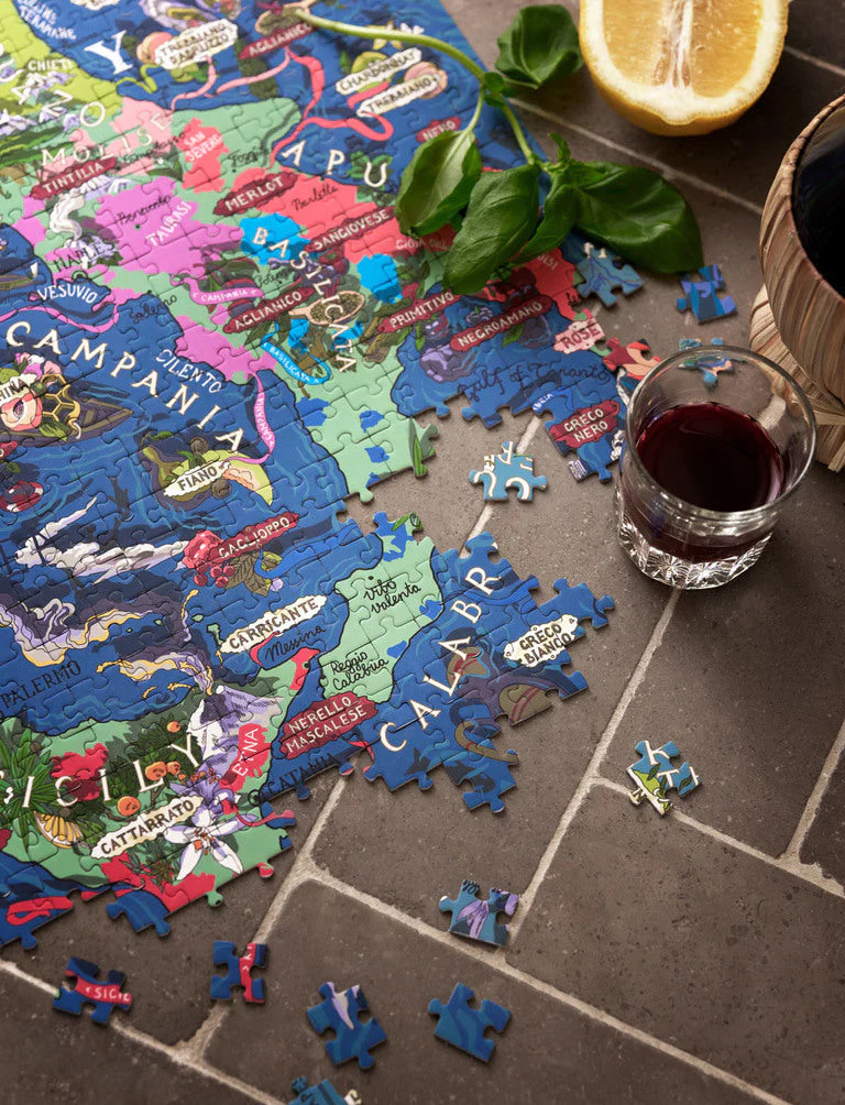 Puzzle s tématikou italských vinařských oblastí a klíčových odrůd typických právě pro Itálii. Krabička obsahuje také profily jednotlivých odrůd, jejich charakteristické vůně a chutě se spoustou tipů na snoubení s jídlem! Ilustrace byly nejprve ručně nakresleny a stojí za nimi Nikita Kulikov, poté pečlivě zkontrolovány s pomocí nejlepších světových someliérů.