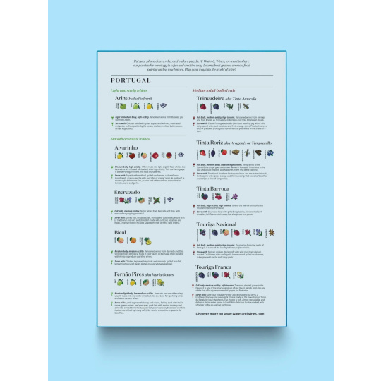 V balení najdete kromě puzzle také profily hroznů, jejich vůně, klíčové vlastnosti a tipy na párování s jídlem, které vám umožní objevit bohatství a rozmanitost portugalské vinařské kultury. Je to víc než jen puzzle, je to oslava vína, kultury a historie země a poutavé dobrodružství, které si musíte vychutnat.