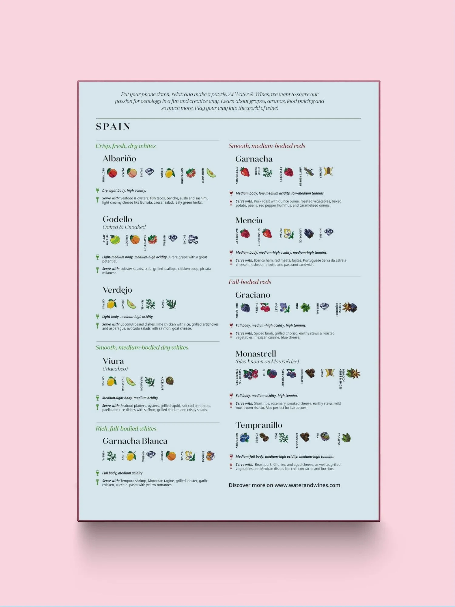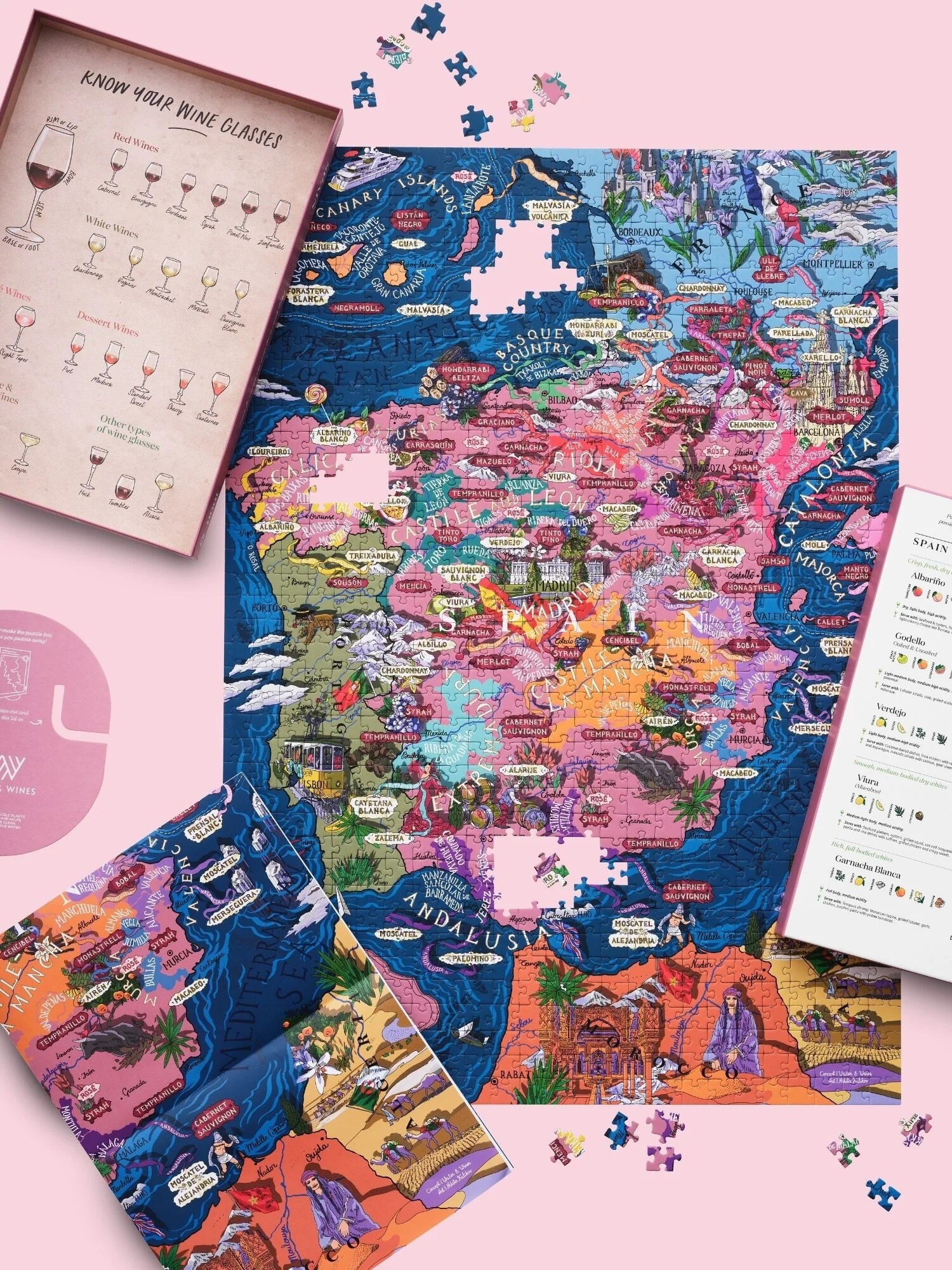 Puzzle s tématikou španělských vinařských oblastí a klíčových odrůd typických právě pro Španělsko. Krabička obsahuje také profily jednotlivých odrůd, jejich charakteristické vůně a chutě se spoustou tipů na snoubení s jídlem! Ilustrace byly nejprve ručně nakresleny a stojí za nimi Nikita Kulikov, poté pečlivě zkontrolovány s pomocí nejlepších světových someliérů.