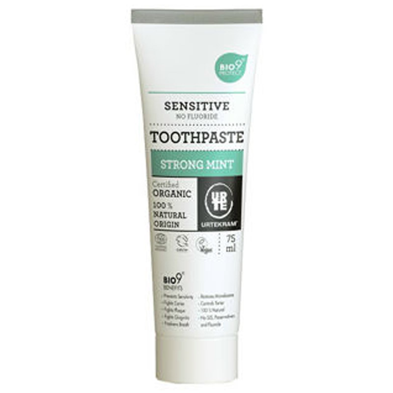Zubní pasta Urtekram Sensitive se silnou osvěžující chutí máty dokonale čistí, chrání a pečuje i o extrémně citlivé zuby a dásně. Pasta zabraňuje citlivosti zubů, efektivně působí proti zubnímu kazu a plaku, zpevňuje sklovinu, obnovuje správnou mikrobiologickou rovnováhu a předchází tvorbě zubního kamene. Pasta nepění.